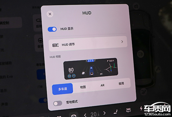 评测车配备32英寸AR-HUD增强现实抬头显示,在中控屏的设置界面内用户可以进行多项调节。除了常规的开关以及显示位置调整外,HUD视图同样支持自定义,可以选择多车道、地图、AR以及极简,并支持雪地模式以及驻车显示歌词功能。