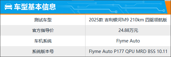 Flyme Auto 2是魅族与吉利联合开发的智能座舱操作系统,2025年8月20日由吉利汽车集团正式发布。系统集成星睿AI大模型,并搭载全球首个可大规模上车的超拟人情感智能体——Eva,支持端到端情感语音交互。桌面采用多层叠加算法以及法线传递技术进行3D渲染,配备无界Dock栏、深度自定义壁纸插件和动态Alive壁纸,应用大卡片及多任务小窗交互模式。评测车搭载的系统版本号为Flyme Auto P177 QPU MRD BSS 10.11,虽然已经接到了10.21版本的推送更新,但是涉及内容多以修复为主,与本次测试项目无关,考虑到时间问题以及网络因素,所以并未进行升级。